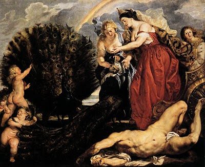 Rubens's painting represents the concluding scene from the story of Io. The giant Argus of the hundred eyes, whom Juno set to watch over Io, was murdered by Mercury. In memory of Argus Juno took his eyes and set them in the tail of her peacock.” (Pieter Paul Rubens: Early Mythological Paintings by Rubens)